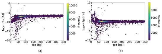 For each event, the pixel with the largest ToT is determined and the time residual of this pixel with respect to the time reference is calculated. To suppress MCP noise, each event is required to have exactly one peak from the MCP-PMT within the recorded window. Timewalk correction is performed by histogramming the time residual versus ToT on a pixel-by-pixel level and subtracting the mean of the corresponding histogram bin. To avoid bias from the timewalk correction, the data are split into two sets and the correction obtained from one set is applied to the other set.