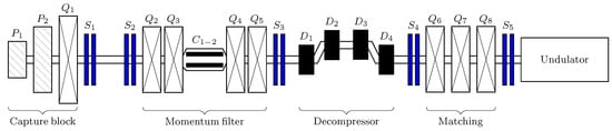 Schematic diagram representing proposed beamline. Here, and are permanent quadrupole magnets, – are electromagnetic quadrupoles, is a pair of horizontal and vertical collimators, – are pairs of steering magnets (vertical and horizontal) and – are dipole magnets of the decompressor chicane.