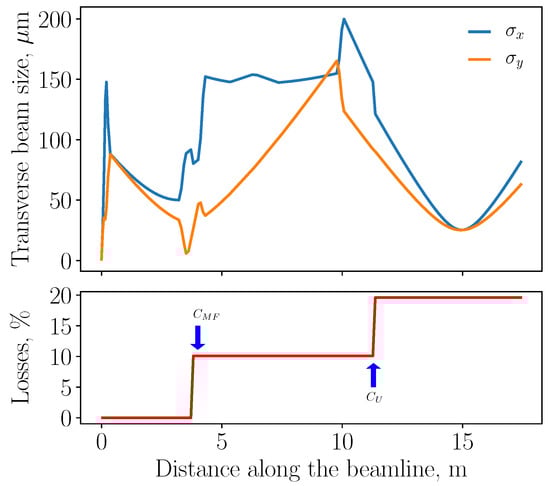 Simulated electron beam horizontal and vertical envelopes (top) and beam losses (bottom) along the beamline. Arrows on the bottom plot show the position of the momentum filter collimator () and collimator before the undulator entrance (). Parameters: electron energy is 350 MeV, decompressor bending angle is 0.35 deg, initial bunch charge is 45 pC. The center of the single-unit undulator is located at 15 m from the source.