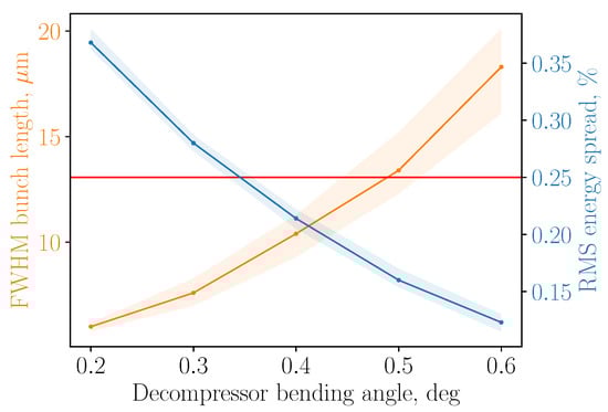 FWHM bunch length (orange) and slice RMS energy spread (blue) as a function of the decompressor bending angle. The solid lines represent the case for the bunch charge of 35 pC. Shaded areas represent the bunch charge variation in the range of (25–45) pC. The initial projected RMS energy spread is equal to 0.5%.
