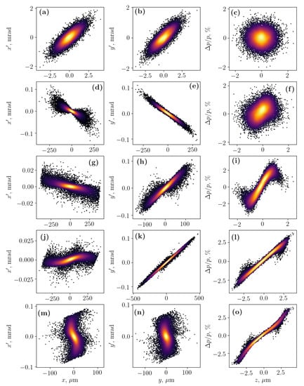 Simulated transverse and longitudinal phase space projections after each beamline section: after the source (a–c), after the capture block (d–f), after the momentum filter (g–i), after the decompressor (j–l) and in the middle of the undulator (m–o).