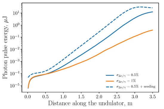 The results of the study are presented in Figure 5 and Figure 6, showing photon energy amplification inside the undulator and the corresponding energy spectrum, respectively. As one can notice, the saturation of the photon pulse energy can be reached after approximately 3.5 m if the initial projected RMS energy spread of the laser-driven electron beam is 0.5%. The corresponding value of the radiation peak brilliance is 7.5 × 10 photons/pulse/mrad/mm/0.1%bw. If the initial projected RMS energy spread is increased to 1%, the saturation of the photon pulse energy along the same undulator cannot be obtained.