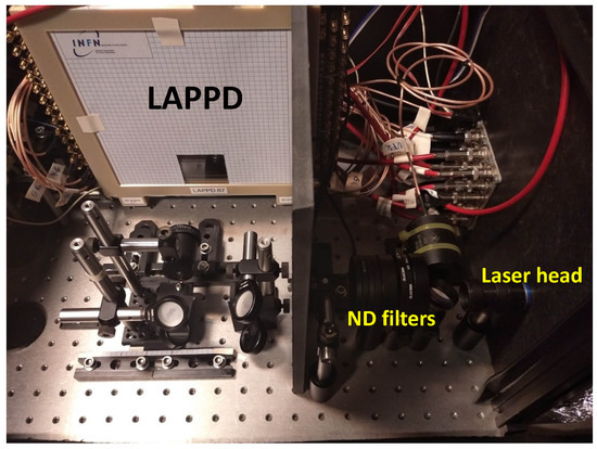 LAPPD Gen-I and Gen-II tiles were first tested in the laboratory using a free-space PICOPOWER-LD laser produced by ALPHALAS [14], with 405 nm wavelength and a tunable repetition rate from 1 Hz up to 50 MHz. Figure 1 shows a picture of the laboratory setup.