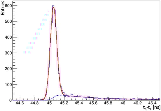 Distribution of the difference between the time of the LAPPD Gen-I signal () and that of the laser trigger () for single PEs. The two components of the model described in the text and fitted to the data are also shown: core component (red line) and component due to backscattered PEs (dashed blue line).