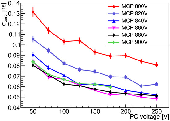 In the case of the Gen-II, a two-dimensional scan of PC and MCP voltages was performed to obtain the best core resolution for single PEs, achieving about 50 ps with 250 V bias for the PC and 860 V for the MCPs (see Figure 4).