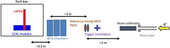 In Figure 6, a schematic view of the experimental setup used for the testbeam at DESY is shown, while a picture of the LAPPD installed within the two sections of the ECAL module is shown in Figure 7.