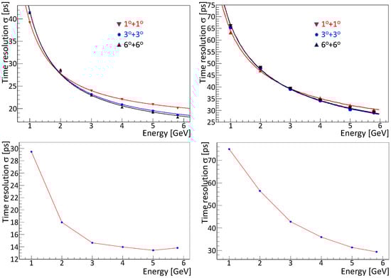 Electrons pointing to the ECAL module were selected using a passive absorber as a collimator. The trigger signal was given by two plastic scintillators in coincidence, and two MCP-PMTs were used to determine the reference time of the incoming electrons, which was found to have a resolution of 12 ps. Three Delay Wire Chambers (DWCs) were used to measure the position of the incoming electrons. The LAPPD was inserted between two sections of the ECAL module, whose front section corresponded to approximately 7 radiation lengths. The system composed of the LAPPD and the ECAL module was inserted inside a dark box and could be rotated to form angles with the electron beam from 0° to 6° in both the horizontal and vertical plane, corresponding to the typical range of incidence angles for particles impinging on the LHCb ECAL surface. Signals produced by the reference MCP-PMTs and the LAPPD were acquired using the same CAEN v1742 digitiser used in the laser-beam tests. Data were taken either with the PC enabled or inhibited. To inhibit the PC, an inverse bias of 50 V was applied between the PC and the first MCP of the Chevron stack. In the configuration with the PC enabled, voltage settings were optimised to achieve the best resolution for electrons with energy of 5 GeV. For the Gen-I device, the optimised biases applied to the PC and MCPs were 400 V and 765 V, respectively. In the case of the Gen-II device, 250 V was applied to the PC and 715 V to the MCPs. In the configuration with the PC inhibited, the optimised biases applied to the MCPs were 900 V and 850 V for the Gen-I and Gen-II devices, respectively. Top plots in Figure 8 show the time resolution of the Gen-I device, with either PC activated or inhibited, as a function of the energy of primary electrons impinging with different angles on the ECAL module. Time resolutions as good as 19 ps (with PC enabled) and 29 ps (with PC inhibited) were measured for primary electrons with an energy of 5.8 GeV. The time resolution obtained with the PC enabled shows a dependence on the energy of primary electrons E that is empirically found to be described reasonably well by the function , with E in GeV, ps GeV and ps. No difference in time resolution is observed between configurations with incidence angles of 3° and 6° (applied on both horizontal and vertical planes). A slight degradation of the time resolution is observed when reducing the incidence angle to 1°. In the PC-inhibited case, the dependence of the time resolution from the energy of primary electrons is described reasonably well by the empirical function , with E in GeV, ps GeV and ps. However, additional tests with higher electron energies are necessary to properly understand the asymptotic performance. In the case of LAPPD Gen-II, only the configuration with incidence angles of 3° in the horizontal and vertical planes was taken into account. Time resolutions as good as 14 ps and 30 ps were measured with the PC enabled and inhibited, respectively. Time resolutions as a function of the energy of primary electrons are shown in the bottom plots of Figure 8. Due to the higher quantum efficiency of the PC, with respect to the Gen-I device, Gen-II performances were slightly better when operating with the PC enabled. Performances with PC inhibited are similar between the two devices, with the LAPPD Gen-I performing slightly better at lower energies.