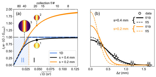 When the fiber projection is smaller than the beam waist (regime I), the effective optical extent is the spectrometer extent , independent of the beam size. However, a more tightly focused and higher intensity beam still results in a higher collection efficiency, because more energy is concentrated in the scattering volume. Equation (3) shows that . Although the intensity decreases inversely proportional to the square of the beam waist , the light throughput increases only linearly . The vertical axis used in Figure 2a is therefore , with normalized to the point design ( mm). The orange curve in Figure 2a shows a hypothetical case of a higher quality laser beam that can be focused to a smaller waist ( mm). The optical extent at large-collection solid angles is still ; however, the maximum k is now twice as large. In regime II, the light collection efficiency is independent of the beam waist, since the full beam is collected in either case over the same , as indicated by the insert for an f/40 collection lens (case 3 in Figure 2).