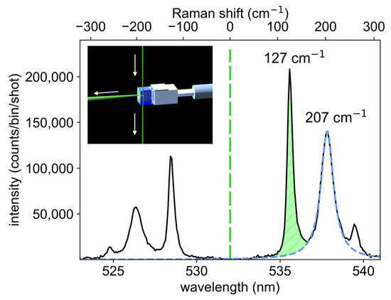 Raman scattering spectrum from the quartz crystal probe. The much brighter Rayleigh signal at 532 nm is effectively blocked by the notch. The area under the 127 cm Stokes–Raman line (shaded green) is used to absolutely calibrate the spectrometer. It overlaps with the broad Lorentzian wings of the adjacent 207 cm line (dashed blue), which must be subtracted from the signal. The inset illustrates the beam intersecting the quartz probe from the top to bottom and the scattered light collected by the central fiber.