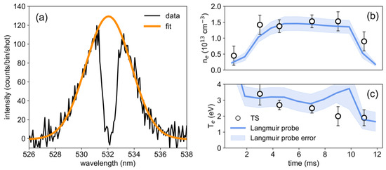 (a) Measured TS spectrum at t = 4.5 ms obtained by averaging 7000 shots. The central 1.5 nm region of the spectrum is suppressed by the notch. The Gauss-fit (orange) has a standard deviation of s = 1.7 ± 0.1 nm, corresponding to a temperature of 2.7 ± 0.3 eV. (b,c) Comparison of the electron density and temperature derived from Langmuir probe measurements (solid lines) and from the TS spectra (circles).