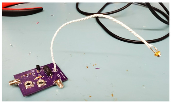 One important concern is how to effectively mount the laser diode. Mounting the laser diode on the printed circuit board and then mounting the entire structure directly above, and in, the mouse’s head is challenging. The mechanical weight of the printed circuit and diode assembly is difficult to distribute and hold in place. In the work here, the laser diode was connected off-board to the driver through a cable as seen in Figure 2. This way, only the laser diode need be placed directly above the mouse’s head, Figure 3. The concern is controlling the shape of the signal so that the laser diode is driven cleanly [3]. As seen in Figure 2, this control was facilitated by using a twisted pair of wires for consistent transmission impedance. It is also desirable to keep these wires as short as possible. The length, however, is limited by the size of the physical devices holding the mouse in place. In the final version of the design, quick disconnects were used, see black connectors in the top image of Figure 4, so that the pulse generator board could be connected to the mouse after the laser diode had been surgically placed in the mouse’s head.