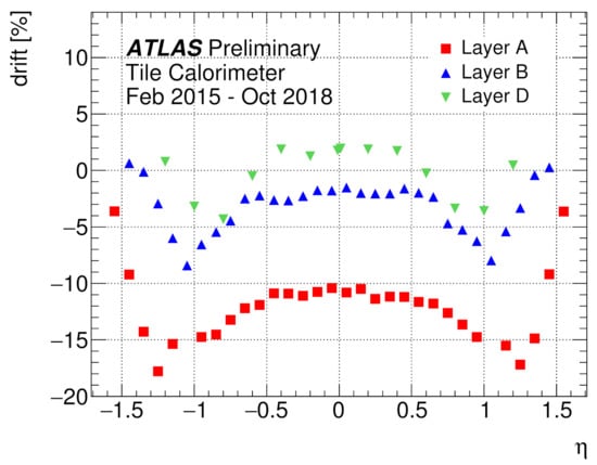 The drift of the Cs response between the beginning and the end of Run-2, shown for cells in different radial layers and as a function of the cells’ pseudorapidity [4]. Cells close to are exposed to higher radiation doses with respect to more central cells in each radial layer.