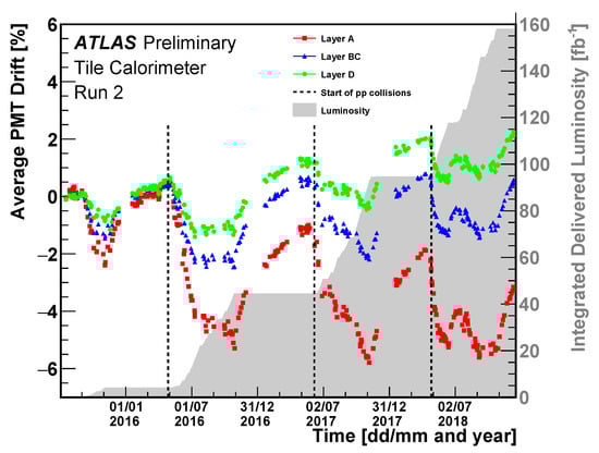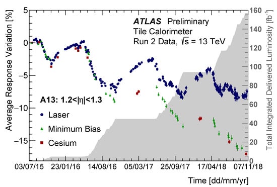 - ATLAS Tile Calorimeter Calibration Public Plots. Available online: https://twiki.cern.ch/twiki/bin/view/AtlasPublic/ApprovedPlotsTile (accessed on 14 August 2022).