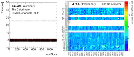 The stability of the calibration is monitored with two complementary methods, the laser events shot during the abort gaps of collision runs (Section 2.2) as well as with the physics collision data. Two examples of identified problems are shown in Figure 5. These problems are then corrected in the data used for physics analyses. The time stability is better than 1 ns.