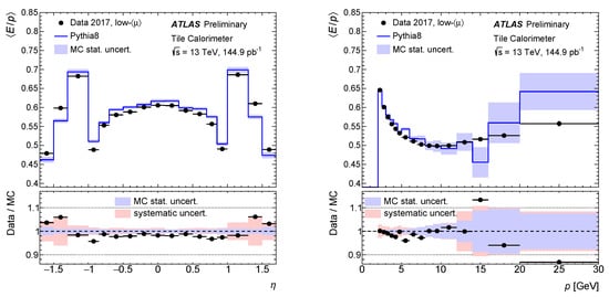 The TileCal response to isolated charged hadrons characterized by the energy over momentum ratio , as a function of pseudorapidity (left) and momentum (right). The lower panels show the ratio of data to MC simulation, systematic uncertainties cover the effects of residual contamination from neutral particles and energy mis-measurements due to energy losses in front of the calorimeter [7].