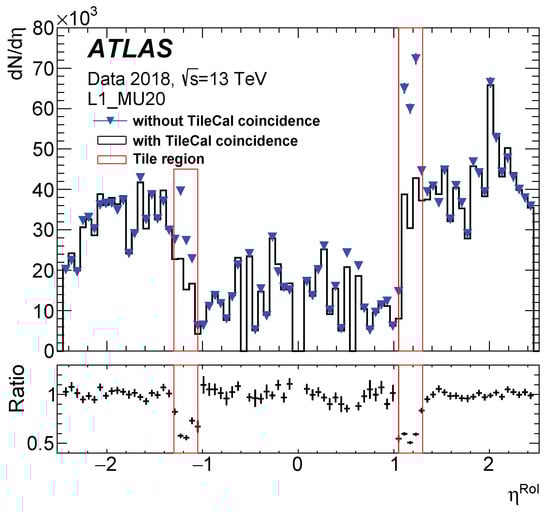 The pseudorapidity distribution, reconstructed using online information, of particles with transverse momentum above 20 GeV in events selected with the first level muon trigger (blue triangles) and the Tile-muon trigger (black line). Their ratio is shown in the lower pad. The coincidence region is highlighted with redrectangles [10].