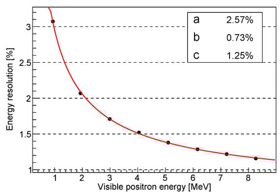 Energy resolution expected for the JUNO experiment obtained by full MC simulation of positrons at different energies. The red line is the best fit curve obtained by using Equation (2). Best fit values for the three parameters are shown in the box [6].