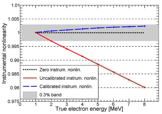Figure 5 shows an example of the application of the DCC technique at event level, where large-PMT channel-level nonlinearities are corrected. The dotted black line represents the ideal case with zero instrumental nonlinearity. The solid red line represents a 2% event-level instrumental nonlinearity originated by assuming an extreme scenario, with 50% channel-level nonlinearity in the 0 to 100 photoelecton range. The dashed blue line shows the corrected instrumental nonlinearity obtained after the application of the channel-wise DCC technique: the instrumental nonlinearity is reduced to <0.3%.