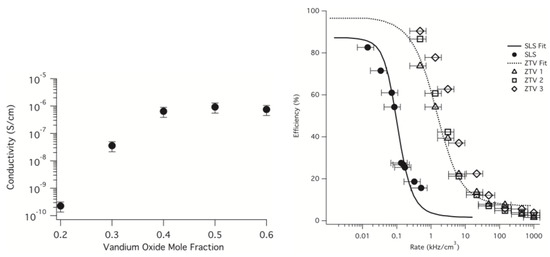 In this context, we developed low resistivity vanadate-based glasses. The lead vanadates ended up with conductivities of the order of 10 10 S/cm, and the samples were not able to hold the high voltage with sparking across the plates. The target conductivity range was obtained with tellurium vanadates doped with zinc oxide (ZnO). Figure 1 (left) shows the electronic conductivity of the binary tellurium vanadate glass as a function of the vanadium oxide mole fraction. The conductivity of the binary system was between 10 6 and 10 10 S/cm and ZnO doping was an economical modifier to reduce the conductivity to within the target range. From 25% to 55% ZnO, conductivity ranged four orders of magnitude from around 10 11 to around 10 15 S/cm.