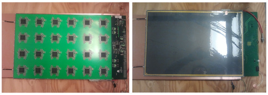 Figure 2. Pictures of the readout (left) and front (right) side of the 1-glass RPC. The readout side picture depicts the array of the DCAL chips and the data concentrator circuitry of the digital readout. The front side picture depicts the cathode glass covering the entire area of the 1 cm × 1 cm pads.