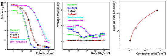 Figure 3. The efficiency (left) and the average pad multiplicity (center) as a function of beam rate for six different RPCs, and the rate at 50% efficiency as a function of conductance per area of the glass plates (right).