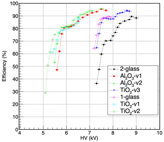 Figure 4 shows the efficiency as a function of the applied high voltage. The standard 2-glass RPC becomes 90% efficient around 8.5 kV. Similarly, if one considers the high voltage value at the 90% efficiency crossing as a measure, for the standard 1-glass RPC and TiO 2 _v3, it is around 7.5 kV. The advantage of the 1-glass RPC over the 2-glass RPC is manifest, and there is no measurable effect on the performance with 0.15 mg/cm 2 TiO 2 coating applied on the anode plate.