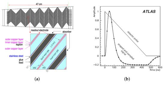 Incoming particles produced in the LHC proton–proton collisions shower in the absorbers and ionize the Liquid Argon. In order to collect the ionization signal produced in the LAr, a high electric field is applied across the gap and the current produced by the drift of the electrons is read out by electrodes. A triangular-shaped pulse is produced and it is then amplified and shaped into a bipolar pulse and digitized at the LHC bunch-crossing frequency of 40 MHz. The geometry of the LAr gap, the readout electrodes with the high voltage lines and the pulse shape are shown in Figure 2.