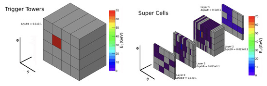Simulation of the energy deposits of a 70 GeV electron reconstructed with the Run 2 Trigger Towers (left) and with the new Super Cells that will be used during Run 3 (right) [4].