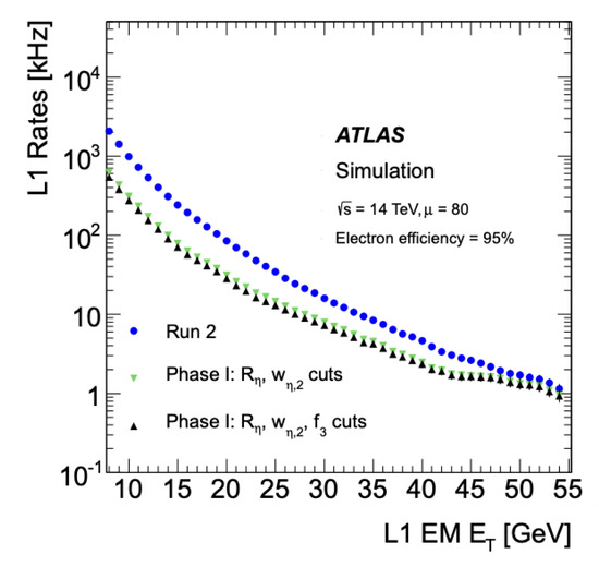 Expected L1 trigger rates in Run 3 as a function of the EM transverse energy threshold () for the case of the Run 2 trigger electronics (blue) and the new upgraded digital trigger electronics with different selections of shower shape variables (black and green) [4].