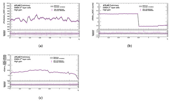 Mean pedestal values in ADC counts (a), mean value of the RMS in ADC counts (b) and mean value of the gain over the LAr Calorimeter cells (c), in a given pseudorapidity () range. Only the cells of the second layer of the electromagnetic barrel on side A (EMBA) are included. The black line shows the values measured at the end of Run 2. The purple dots show the values measured after the refurbishment of the front-end crates and front-end boards.
