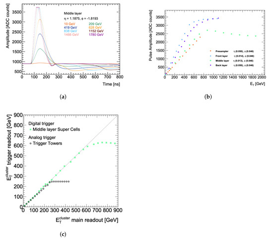 The new digital trigger readout is a completely new system installed for the Phase-1 upgrade that had to be validated. For this purpose, the full chain of the LAr digital trigger data acquisition, including the front-end and the back-end electronics, is tested after the installation. A set of input signal scans is defined and performed in order to validate the new system: mapping scans to check the connectivity of all channels, timing scans to align the various components in time, and calibration scans to validate the pedestal values, the pulse shape and the the gain value and linearity. The pulse shape collected by the LATOME can be verified by performing the so-called “delay runs”, consisting of a series of injected calibration pulses with a single input signal current with an increasing delay, used for reconstructing the pulse shape with high granularity of readout points (each every 1.04 ns) as shown in Figure 7 for different energy regimes. Distortion in the pulse shape can be seen at high energy due to saturation effects. The linearity of the response of the new digital trigger readout electronics can be measured using the so-called “ramp runs”, consisting of a series of injected calibration pulses with different amplitudes and measuring the peak ADC value with respect to the pedestal as a function of the corresponding to the injected pulse, as shown in Figure 7. The ADC values are linearly increasing with the deposited up to about 800 GeV, where saturation of the SC pulse occurs. There is no reference from Run 2 available for the new digital trigger readout, but the performance of this new readout path can be compared to the legacy analog trigger readout and to the main readout. Particularly, the deposited in the SCs can be compared to the deposited in the TTs and to the sum of the in the corresponding cells of the LAr calorimeter for injected signals. The SC data are collected by the new LATOME boards while the energy deposited in the cells and in the TTs is collected by the legacy main and trigger readout systems. As shown in Figure 7, the deposited energy measured by the LATOME of the new digital trigger system corresponds well to the one measured by the TTs of the legacy trigger system and by the main readout system up to the level where the signal on the legacy TTs or on the SCs is saturated.
