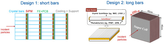 To address this challenge, a new detector layout is proposed (Design 2 in Figure 1) with long crystal bars arranged to be orthogonal to each other in two neighboring layers for a maximum longitudinal segmentation, minimum inactive materials in between and a significant reduction in readout channels. High transverse granularity is expected to be realized by combining the information of every two adjacent layers. The basic module of a “supercell” is in the transverse plane with, typically, in depth. Each crystal bar is read out by 2 SiPMs at two ends, which can also provide timing information from the two sides for positioning reconstruction, clustering and particle identification. Nevertheless, this layout also poses a challenge for 3D pattern recognition and requires the development of dedicated reconstruction software, which will be briefly introduced in Section 3.