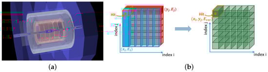 The CEPC baseline detector (“CEPCv4”) in the CEPC Conceptual Design Report [3] and the PFA software “ArborPFA” [15] were implemented in the CEPC software framework [16] for the PFA performance studies and PFA optimizations. Baseline sub-systems from the inside out include silicon vertex detector, Time Projection Chamber (TPC), silicon-tungsten (SiW) ECAL, RPC-based HCAL, magnet coils and the return yoke as a muon detector, as shown in Figure 2a. The SiW-ECAL was replaced by finely segmented crystal bars with two sets of granularity, i.e., and . The granularity of corresponds to an ideal setup to fully exploit 3D information to evaluate the potentials and optimize the PFA parameters for crystals. The slightly coarser granularity of is the goal for the layout of long crystal bars (Design 2), assuming that the dedicated reconstruction software can finally resolve ambiguities of pattern recognition in shower clustering due to the special geometry arrangement. The crystal option implemented for the crystal ECAL was selected to be the Bismuth Germanate (BGO) at this stage.