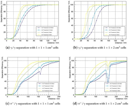As shown in Figure 3, the separation efficiency of two increases along with a higher energy threshold (implemented for each crystal cell) in the updated ArborPFA with the multi-threshold reconstruction scheme. The performance of the granularity of is similar to the ideal granularity of . It would be more challenging to separate hadronic clusters from EM ones, due to the complicated hadronic shower profiles leading to issues of matching the charged clusters in calorimeters with trackers. Clusters of the hadrons will be much more widely distributed in 3D space, and fluctuations in hadronic shower profiles and energy depositions are much more significant, compared with EM showers. Parameters concerning the distance between clusters and tracks can hardly be effective enough. For the particle-flow algorithms, there is always a significant chance that clusters originally from a hadron will not be correctly associated with its track.