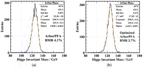 Higgs boson mass resolution with the ArborPFA algorithm. (a) BMR with the crystal ECAL using the default ArborPFA. (b) BMR with the crystal ECAL using the optimized ArborPFA.