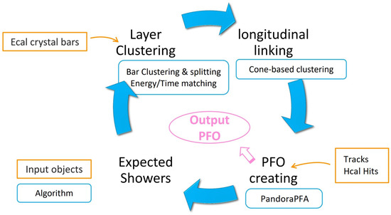- Thomson, M.A. Particle flow calorimetry and the PandoraPFA algorithm. Nucl. Instrum. Meth. A 2009, 611, 25–40. [Google Scholar] [CrossRef]