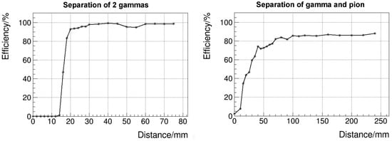 The separation of near-by particles is based on the overlay of events of single particles generated by a particle gun with varying positioning offsets. Showering events of s and charged pions before entering the ECAL are excluded for further analysis. The separation efficiency is defined as the ratio of the events with two correctly reconstructed physics objects from ArborPFA algorithm (PFA Objects, or PFOs) and the total events. A correct reconstruction is defined as the PFO energy being in the range of 3.3–6.6 GeV for incident 5 GeV photons, and of 9.9–10.1 GeV for incident 10 GeV charged pions. The latter scenario corresponds to an essential part of the ArborPFA, i.e., cluster matching between trackers and calorimeters for charged particles, where trackers can provide the momentum information with much higher accuracy than calorimeters.