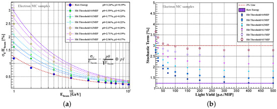 Energy resolution under different energy thresholds and crystal light yields. (a) The EM energy resolution when different energy thresholds are implemented on calorimeter hits. The light yield is set to 100 detected photons per MIP. (b) The stochastic term of the EM energy resolution with varying light yields (number of detected photons per MIP) and energy thresholds for hits.