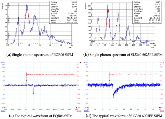 Single photon spectrum and typical waveforms in the oscilloscope of DUTs. Red pulses in (c,d) correspond to trigger signals.