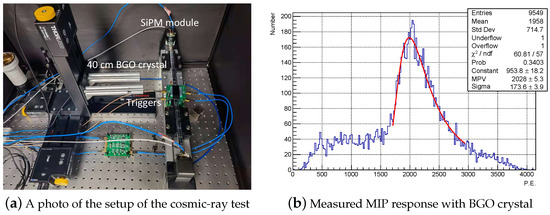 A BGO crystal was tested with cosmic-ray muons to evaluate the MIP response. As shown in Figure 9a, the crystal bar was wrapped with ESR film and placed onto a rail. Two apertures were cut out through the wrapping of the two ends for the light detection at SiPMs. Hamamatsu C13365-3050SA [27] SiPM modules ( active area) were coupled to the two sides of the crystal bar with silicone grease (index of refraction 1.465). In addition, two triggers were used to select coincidence muon events. The most probable value of the MIP response is 2028 p.e./MIP, as shown in Figure 9b. The fact that the trigger size is larger than the crystal cross section leads to a structure at the left side of the MIP signal, i.e., muons penetrates only partially but not the full crystal. It shows that the MIP response can meet the requirement, but we also need to consider the dynamic range as another critical issue, which remains under study.