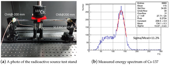 Measurements with radioactive sources are important to evaluate the energy resolution and to validate the digitization tool. Tests were performed with the same BGO crystal bar of as mentioned above. Signals were read out by two SiPMs (Hamamatsu S13360-6025PE) directly air-coupled with each end. A slide rail system was used to improve the stability for better SiPM–crystal coupling. A radioactive source of Cs-137 was placed on the 1D movable rail to scan along the crystal length direction, as shown in Figure 10a. It should be noted that the source collimation diameter is around 8 mm. Figure 10b shows the energy resolution is 11.2% for 662 keV gammas, and the full-energy peak corresponds to around 134 p.e. at the SiPMs.