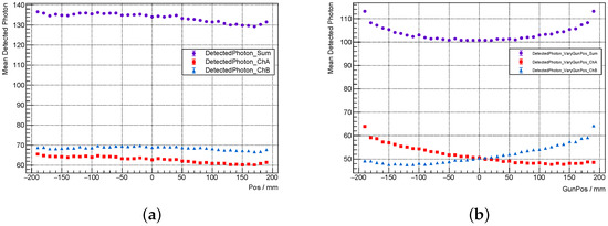 The response uniformity along the crystal bar was measured with the same radioactive test-stand mentioned above by moving the radioactive source along the crystal bar length direction. The results from measurements and Geant4 optical simulation are shown in Figure 11a,b. The simulation assumed the intrinsic light yield of BGO crystals is 8200 p.e./MeV, and the crystal surface roughness was considered. Here, the incident-angle distribution of gamma-rays was not implemented and the simulation will be improved in the future.