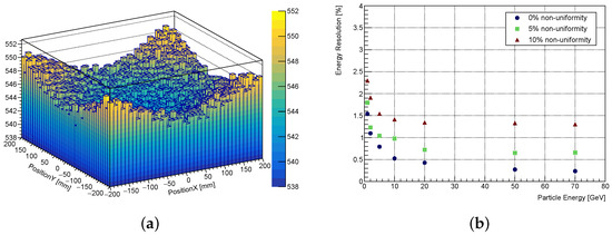 A 2D uniformity map is obtained in simulation with muons perpendicularly passing through the module, as shown in Figure 12a, and was implemented in the digitization tool for an ECAL module with the transverse size of with the detector layout of crossed long crystal bars. The 2D non-uniformity effect will lead to position dependence for the energy reconstruction. Monte Carlo samples of high-energy electrons were used to evaluate the impacts on the energy reconstruction of EM showers, dependent on different levels of non-uniformity, as shown in Figure 12b. Therefore, the crystal-SiPM response uniformity needs to be well-controlled and carefully calibrated.