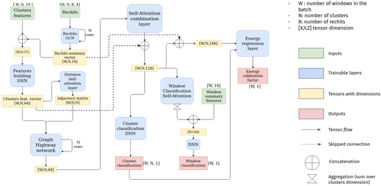 DeepSC model architecture. The input to the network consists of selected features and rechits of the clusters that fall into a predefined geometrical window. Using dense layers, the latent features are extracted from the initial input; they are processed and combined together using different types of graph architectures: Graph Convolutional Network (GCN) and Graph Highway Network (GHN). Self-attention layers are used as well, to help the network with focusing on the most important features/inputs. The final outputs are the following: information on whether each of the clusters belongs to the SuperCluster (cluster classification), the type of the particle from which the SuperCluster originated (window classification), and energy correction (energy calibration factor).