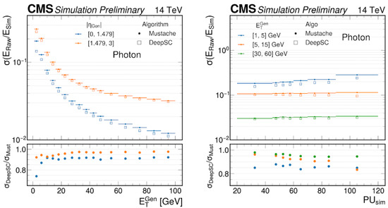 Both Mustache and DeepSC algorithms were applied to the same dataset to compare the performance. Figure 2 shows the resolution of the reconstructed uncorrected SuperCluster energy () divided by the true energy deposits in ECAL () versus the transverse energy of the generated particle (left) and the number of simulated pileup (PU) interactions (right). The resolution is computed as being half the difference between the 84% quantile and the 16% quantile (one ) of the / distribution in each bin. The lower panel shows the ratio of the resolution of the two algorithms: /. The results are presented for photons; the performance for electrons is similar.