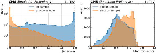 The output of the model for particle identification is the likelihood for the clusters in the window to originate from electron/photon/jet (score). In Figure 3, we show the results obtained for the jet scores in the jet and photon data samples (left), and the electron scores in the photon and electron samples (right).