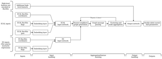 - Additional human-engineered features are added to the learned features that were not encoded in the initial hit collection. In particular, two additional features that describe the amount of energy leakage at the back of the ECAL and the energy density from pileup events, are concatenated to the learned features.