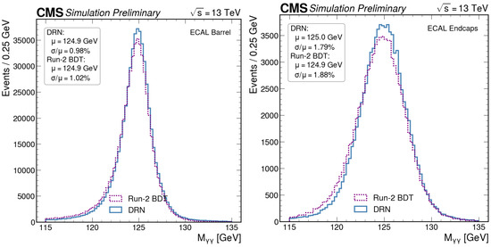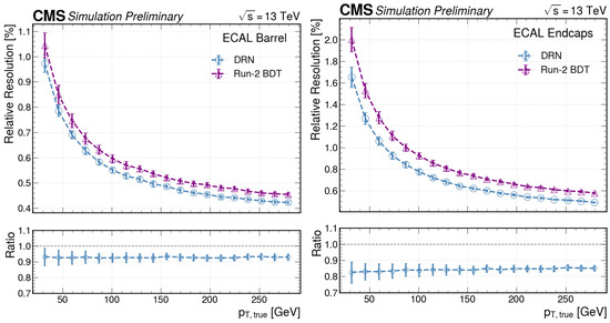 In this case, the DRN is able to obtain an improved resolution with respect to the BDT by a factor of >5%, both in the barrel and endcaps of the ECAL.