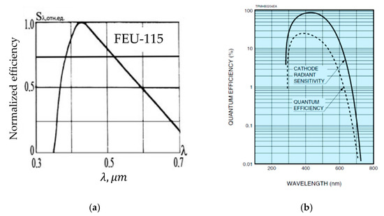 Detection efficiency vs. wavelength for: (a) FEU-115 PMT, (b) R580 PMT.