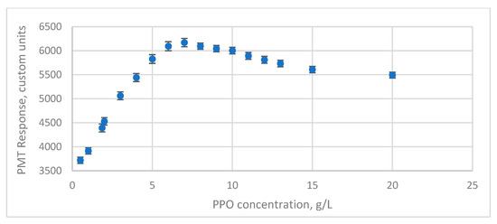 The PMT response with different fluor concentrations was measured to optimize the concentrations of PPO. The total light output measured by the R580 PMT is presented in Figure 4. The result from the FEU-115 PMT is not shown as the shape of the total response for this PMT is the same as for the R580 PMT with the matching peak at 7 g/L. Here, the PMT response is the maximum pulse height in the ADC bins units.